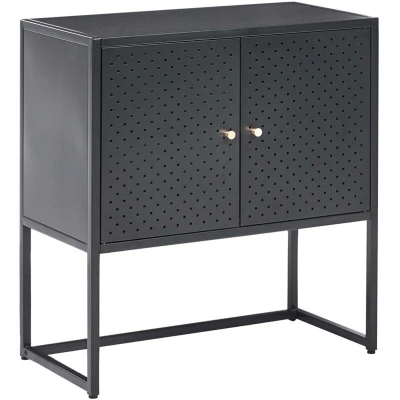 Office Cabinet with Open Shelves. Introduce modern industrial flair to your office with this metal storage cabinet. Constructed from powder-coated steel, it offers a sleek look and durability, ensuring it stays functional for years to come. The cabinet’s doors feature a perforated design with small holes, providing a refined visual accent and ventilation for all your essentials. Details: Product Type: Office Cabinet General Color: Black Material Type: Metal Main Material: Steel Legs material: Metal Shelves number: 2 Doors Opening: Standard Drawers: No Finish: Powder Coated Key Locked: No Number of Doors: 2 Shelves: Yes Dimensions: Depth: 35 cm Width: 72 cm Height: 75 cm Weight: 11 kg Top Weight Capacity: 13 kg Offer Includes: 1 x Storage Unit Key Features: Modern Design, Great for Industrial Interiors, Stable and Durable Construction, Ideal for Home and Office Workspace, Leg Caps for Surface Protection Assembly Information: Full Assembly Required. 20-40 min. Maintenance tips: Steel: