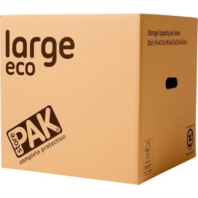 STURDY & REUSABLE - Crafted with double-layered, strong cardboard for durability and reusability, perfect for multiple moves or storages. ECO-FRIENDLY MATERIAL - UK-made with 100% recycled FSC-certified cardboard, promoting sustainability with water-based inks and commitment to recyclable plastic. EFFORTLESS HANDLING - Built with integrated handles for easy and comfortable lifting, making moving hassle-free and convenient. VERSATILE PACKING - Recommended for house moves, storage, or office items stacking, ensuring secure storage for your belongings during transitions. GENEROUS CAPACITY - Each pack includes 10 large boxes, boasting external dimensions of H 40.5cm x W 40.5cm x D 40.5cm and an internal 64-litre capacity. COST-EFFECTIVE STORAGE SOLUTION - From decluttering to full-scale moves, the StorePAK ECO boxes offer a budget-friendly, robust solution for diverse storage needs. SECURE & PRACTICAL SETUP - Easy to assemble and break down, just secure the bottom with parcel tape for a reliable storage solution.