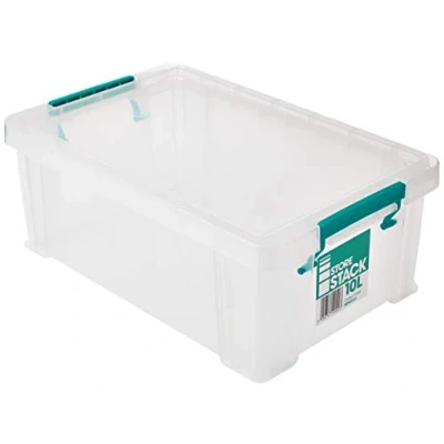 Heavy duty storage for the home, office or warehouse Reinforced base and corners for extra strength Handles clip the included lid securely in place Stackable, with or without the lid Capacity: 10 litre Can hold 2 reams of A4 paper Dimensions: W400 x D255 x H150mm Colour: Clear