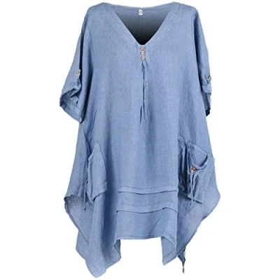 Storm Island DT006 Ladies Italian Linen Front Pockets Tunic Top Women's Lagenlook V Neck Quirky (Denim, UK 22 24)
