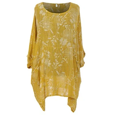 Storm Island Italian Ladies Floral Batwing Sleeve Top Women Lagenlook Tunic Cotton Shirt Plus (Yellow, 22 24 UK)