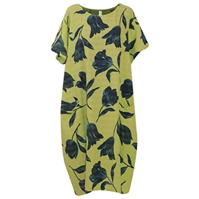 Storm Island Italian Ladies Printed Long Dress Tunic Women Cotton Short Sleeve Shirt Top (Lime, One Size UK 14 22)