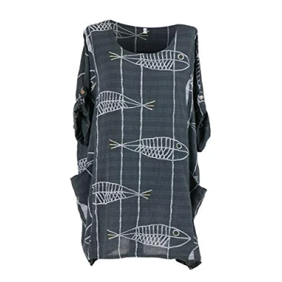 Storm Island Italian Ladies Round Neck Cotton Lagenlook Fish Print Top Women Dress Shirt Plus (Charcoal, One Size 12 20 UK)