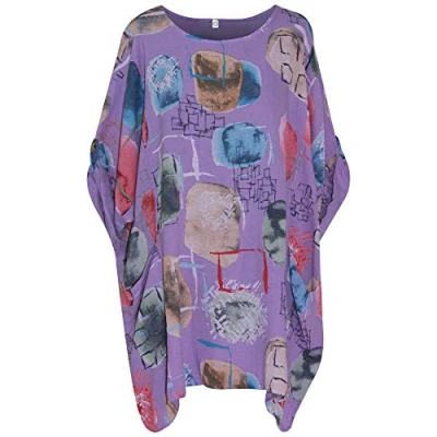 Storm Island Italian Ladies Round Neck Cotton Lagenlook Fish Print Top Women Dress Shirt Plus (Lilac 2, One Size 14 24 UK)