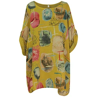 Storm Island Italian Ladies Round Neck Cotton Lagenlook Fish Print Top Women Dress Shirt Plus (Mustard 2, One Size 14 24 UK)