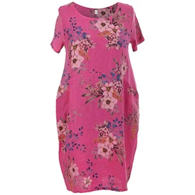 Storm Island Ladies Italian Floral Linen Top Women's Lagenlook Tunic Dress Shirt Ribbed Sides and Sleeves SI086 (Fuchsia, One Size Fits UK (12 18))