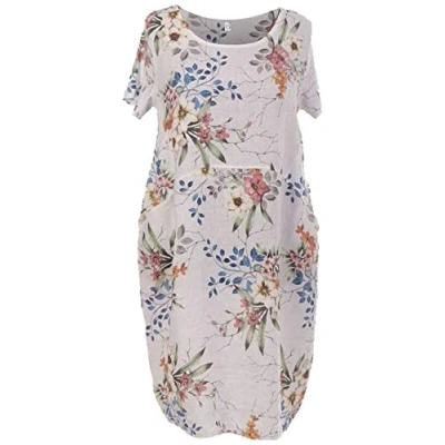Storm Island Ladies Italian Floral Linen Top Women's Lagenlook Tunic Dress Shirt Ribbed Sides and Sleeves SI086 (White, One Size Fits UK (12 18))