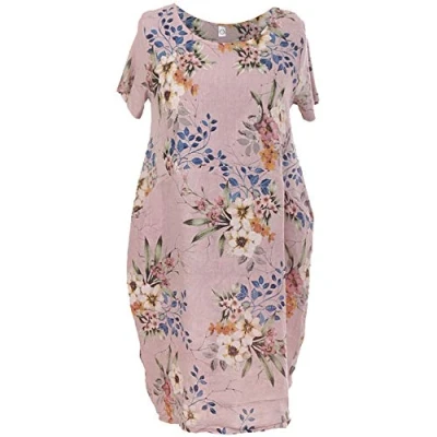 Storm Island Ladies Italian Linen Dress Ribbed Short Sleeves Sides Women Floral Lagenlook Top (Pink, 12 14 UK)