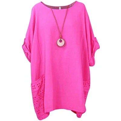 Storm Island Ladies Italian Plain Top Women Lagenlook Cotton Baggy Dress Two Pockets Necklace SI099 (CERIES, UK 12 14)
