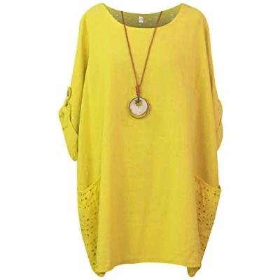Storm Island Ladies Italian Plain Top Women Lagenlook Cotton Baggy Dress Two Pockets Necklace SI099 (Mustard, UK 12 14)