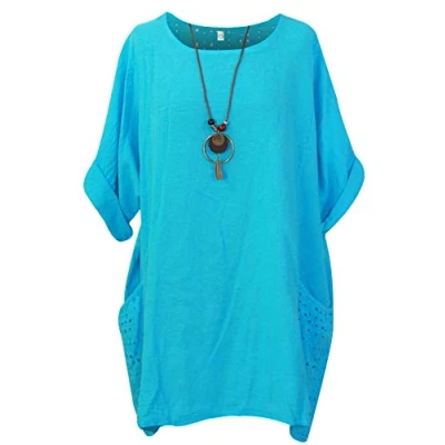 Storm Island Ladies Italian Plain Top Women Lagenlook Cotton Baggy Dress Two Pockets Necklace SI099 (Turquoise, UK 12 14)