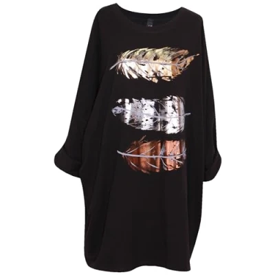 Storm Island® Ladies Italian Top Women Long Sleeves Tunic Summer Shirt Feather Print Foil Round Neck Plus Size Fashion Party Oversized Dress for Girls UK 14 24