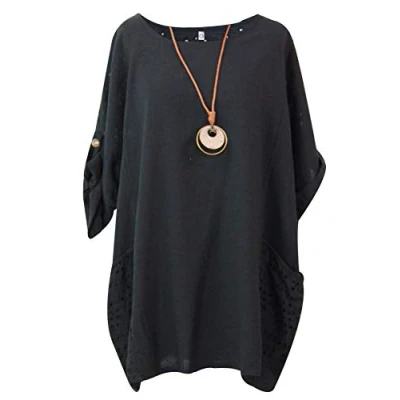 Storm Island Ladies Plain Cotton Top Womens Lagenlook Tunic Baggy Dress Shirt Lace Pockets SI099 (Black, One Size UK Fit 14 22)