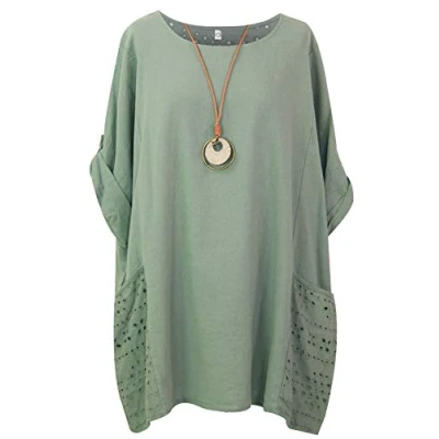 Storm Island Ladies Plain Cotton Top Womens Lagenlook Tunic Baggy Dress Shirt Lace Pockets SI099 (Khaki, One Size UK Fit 14 22)