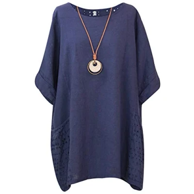 Storm Island Ladies Plain Cotton Top Womens Lagenlook Tunic Baggy Dress Shirt Lace Pockets SI099 (Navy, One Size UK Fit 14 22)