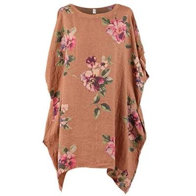 Storm Island New Ladies Italian Floral Lagenlook Linen Tunic Top Womens Scoop Neck Dress (Brown, 20 22 UK)