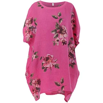 Storm Island New Ladies Italian Floral Lagenlook Linen Tunic Top Womens Scoop Neck Dress (Fuchsia, 20 22 UK)