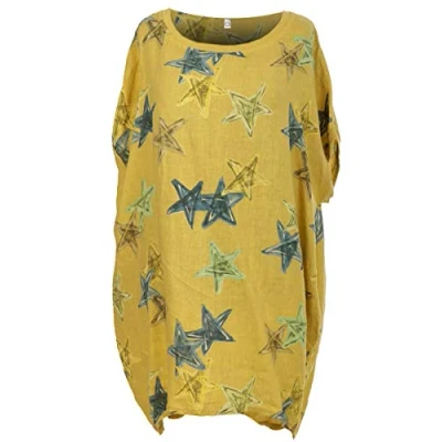 Storm Island New Ladies Italian Floral Lagenlook Linen Tunic Top Womens Scoop Neck Dress (Star Print: Mustard, 24 26 UK)