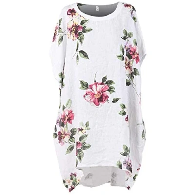 Storm Island New Ladies Italian Floral Lagenlook Linen Tunic Top Womens Scoop Neck Dress (White, 20 22 UK)
