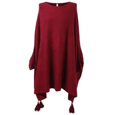 Storm Island Plain Ladies Poncho Plus Size Batwing Sleeves Tassels Knitted Winter Wear Tunic (Wine, One (UK Fit 18 32))