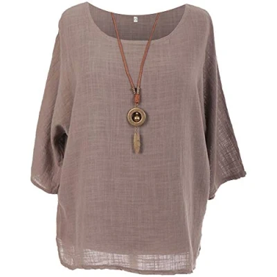 COTTON SUMMER TOP WITH NECKLACE: This AUTHENTIC "Made in Italy" premium quality soft and lightweight fabric (100% Cotton) Plain Colorful top with "NECKLACE" gives you a very stylish and smart look this summer. Its cool solid colors gives a chic appearance. Round neck with 3/4 sleeves loose fitting which is very comfortable to wear in summer and spring seasons. This Casual dress for ladies gives a very stylish look and a relaxed feeling. A very nice Casual Summer dress for you. SIZE GUIDE: It is a loose fit. Length middle: 28 inches, Pit to Pit 26 inches. Top is comes with Necklace LADIES CASUAL TOP: Summer Casual Tunic Shirt for women nice to pair with jeans, denim shorts, skirts, shorts, leggings, skirts, work pants for your own style. Women's summer sleeveless blouses perfect for Casual Wear, Cocktail, festive, wedding, Work, Party, Club, Office, School, Daily wear, travel, vacation, party, and so on ONE SIZE: If you are ONE/PLUS size, as we are one of the best Amazon sellers in providing variety of styles for ONE and Plus Sized exceptional & smart working ladies. This Amazing Italian One size Top is suitable for all occasions, perfect for everyday wear. It can be worn at home, outdoors or other activities in spring and summer seasons. WASH CARE: You can wash this Plain Tunic Top by hand or by machine. Cool water, gentle laundry detergent, and air drying are the best ways to prevent shrinking, wrinkling, and fading.