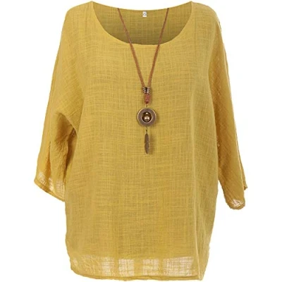 COTTON SUMMER TOP WITH NECKLACE: This AUTHENTIC "Made in Italy" premium quality soft and lightweight fabric (100% Cotton) Plain Colorful top with "NECKLACE" gives you a very stylish and smart look this summer. Its cool solid colors gives a chic appearance. Round neck with 3/4 sleeves loose fitting which is very comfortable to wear in summer and spring seasons. This Casual dress for ladies gives a very stylish look and a relaxed feeling. A very nice Casual Summer dress for you. SIZE GUIDE: It is a loose fit. Length middle: 28 inches, Pit to Pit 26 inches. Top is comes with Necklace LADIES CASUAL TOP: Summer Casual Tunic Shirt for women nice to pair with jeans, denim shorts, skirts, shorts, leggings, skirts, work pants for your own style. Women's summer sleeveless blouses perfect for Casual Wear, Cocktail, festive, wedding, Work, Party, Club, Office, School, Daily wear, travel, vacation, party, and so on ONE SIZE: If you are ONE/PLUS size, as we are one of the best Amazon sellers in providing variety of styles for ONE and Plus Sized exceptional & smart working ladies. This Amazing Italian One size Top is suitable for all occasions, perfect for everyday wear. It can be worn at home, outdoors or other activities in spring and summer seasons. WASH CARE: You can wash this Plain Tunic Top by hand or by machine. Cool water, gentle laundry detergent, and air drying are the best ways to prevent shrinking, wrinkling, and fading.