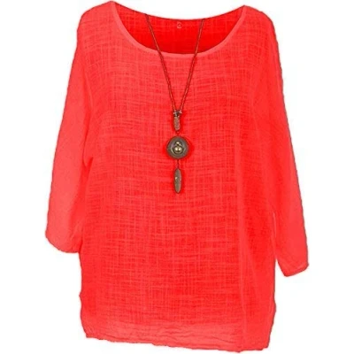 COTTON SUMMER TOP WITH NECKLACE: This AUTHENTIC "Made in Italy" premium quality soft and lightweight fabric (100% Cotton) Plain Colorful top with "NECKLACE" gives you a very stylish and smart look this summer. Its cool solid colors gives a chic appearance. Round neck with 3/4 sleeves loose fitting which is very comfortable to wear in summer and spring seasons. This Casual dress for ladies gives a very stylish look and a relaxed feeling. A very nice Casual Summer dress for you. SIZE GUIDE: It is a loose fit. Length middle: 28 inches, Pit to Pit 26 inches. Top is comes with Necklace LADIES CASUAL TOP: Summer Casual Tunic Shirt for women nice to pair with jeans, denim shorts, skirts, shorts, leggings, skirts, work pants for your own style. Women's summer sleeveless blouses perfect for Casual Wear, Cocktail, festive, wedding, Work, Party, Club, Office, School, Daily wear, travel, vacation, party, and so on ONE SIZE: If you are ONE/PLUS size, as we are one of the best Amazon sellers in providing variety of styles for ONE and Plus Sized exceptional & smart working ladies. This Amazing Italian One size Top is suitable for all occasions, perfect for everyday wear. It can be worn at home, outdoors or other activities in spring and summer seasons. WASH CARE: You can wash this Plain Tunic Top by hand or by machine. Cool water, gentle laundry detergent, and air drying are the best ways to prevent shrinking, wrinkling, and fading.