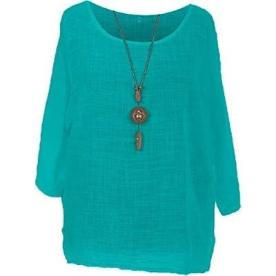 COTTON SUMMER TOP WITH NECKLACE: This AUTHENTIC "Made in Italy" premium quality soft and lightweight fabric (100% Cotton) Plain Colorful top with "NECKLACE" gives you a very stylish and smart look this summer. Its cool solid colors gives a chic appearance. Round neck with 3/4 sleeves loose fitting which is very comfortable to wear in summer and spring seasons. This Casual dress for ladies gives a very stylish look and a relaxed feeling. A very nice Casual Summer dress for you. SIZE GUIDE: It is a loose fit. Length middle: 28 inches, Pit to Pit 26 inches. Top is comes with Necklace LADIES CASUAL TOP: Summer Casual Tunic Shirt for women nice to pair with jeans, denim shorts, skirts, shorts, leggings, skirts, work pants for your own style. Women's summer sleeveless blouses perfect for Casual Wear, Cocktail, festive, wedding, Work, Party, Club, Office, School, Daily wear, travel, vacation, party, and so on ONE SIZE: If you are ONE/PLUS size, as we are one of the best Amazon sellers in providing variety of styles for ONE and Plus Sized exceptional & smart working ladies. This Amazing Italian One size Top is suitable for all occasions, perfect for everyday wear. It can be worn at home, outdoors or other activities in spring and summer seasons. WASH CARE: You can wash this Plain Tunic Top by hand or by machine. Cool water, gentle laundry detergent, and air drying are the best ways to prevent shrinking, wrinkling, and fading.