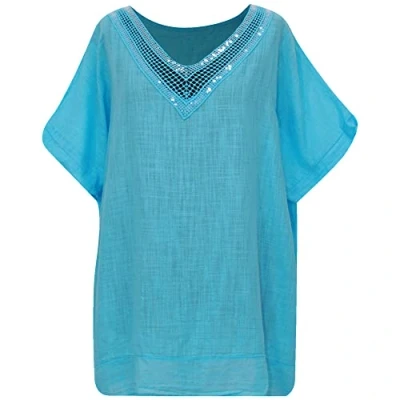Storm Island Women Clothes Italian Plus Size Top Ladies Cotton V Neck Sequin lace Tunic Short Sleeve Shirt 16 24UK (One fit 24 UK, Turquoise)