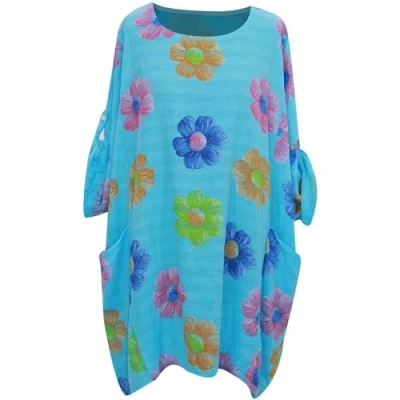 Storm Island® Women Italian Top Floral Print Cotton Summer Dress Tunic Plus Size for Round Neck Pullover Shirt Girls UK 12 22 Turquoise