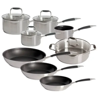 This Stoven Soft Touch Induction set includes a 8 piece cookware set which includes a 14cm non-stick milk pan, 16cm (1.5L) saucepan with strainer lid, 18cm (2.0L) saucepan with strainer lid, 20cm (2.6L) saucepan with strainer lid, 24cm non-stick frying pan plus a 20 and a 28cm non-stick frying pan and a 28cm (3L) sautese.The Stoven Soft Touch Induction 8 Piece Cookware Set is the perfect choice if you are looking for your first set of cookware, replacing an old set or adding to your collection. Ideal for novice and competent cooks alike. Stainless steel cookware is a popular and cost effective choice as it provides durability and consistent results whilst being hard wearing and easy to clean.The Stoven Soft Touch Induction 20cm Non-Stick Frying Pan is ideal for everyday use. A smaller sized frying pan is always handy to have in the kitchen and this 20cm non-stick version fits the bill perfectly. Great for scrambled eggs, omelettes or fried eggs, it can also be used for frying and browning smaller portions of meat and fish.The Stoven Soft Touch Induction 28cm Non-Stick Frying Pan is ideal for everyday use. A large frying pan such as this 28cm non-stick version is a essential when browning larger quantities of meat or when frying larger portions of meat or fish.The Stoven Soft Touch Induction 28cm Sauteuse is a perfect addition to any kitchen. Its versatility alone makes this a great value item of cookware. Equally at home in the oven as it is on the hob, this 28cm sauteuse from Stoven has a 3 litre capacity and is ideal for frying, searing, sauteing and simmering. Perfect for pasta dishes, casseroles and stews, the lid also allows for braising and slow roasting. Two riveted side handles allows the Stoven Sauteuse to be easily moved from hob to oven, even when full.Stainless steel cookware is a popular and cost effective choice as it provides durability and consistent results whilst being hard wearing and easy to clean.Suitable for all hob types including induction, Stov en Soft Touch Induction Cookware is also oven safe up to 180°C.Stoven Soft Touch Induction Cookware is dishwasher safe although we recommend hand washing for longevity. This Stoven Soft Touch Induction set is covered by a Stoven lifetime guarantee.