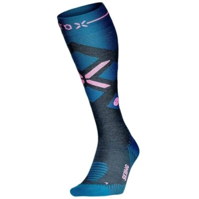 Stox Merino Skiing compression socks for women combine natural Merino wool with a technical yarn blend to offer support, comfort and protection during long days on the mountain. They are designed specifically for skiing, providing a close fit and targeted support where it is most useful. The fabric mix of Merino wool, polyamide and elastane delivers natural odour resistance, temperature regulation and stretch. Merino wool helps to moderate temperature and manage moisture next to the skin, while polyamide increases durability and elastane ensures a snug, adaptive fit. Technical features include pre-shaped right and left socks for an anatomical fit, and strategic padding for shock absorption in the heel and forefoot. The compression element provides graduated support along the calf to aid circulation, reduce muscle fatigue and limit swelling over a long day on piste or during multi-day touring. These socks are slim enough to be worn under exterior ski socks or on their own with alpine or touring boots. The combination of fit, support and odour control makes them suitable for skiing, travel and recovery periods after activity.