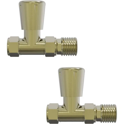 General description A pair of Straight Brushed Brass Lockshield Valves, beautifully engineered to integrate into any modern or minimalist bathroom. These coordinating valves neatly finish the overall look while ensuring your towel rail continues to perform effectively. Technical specifications Finish: Brushed Brass Compact design Industry standard 15mm connection 1/2" BSP MI outlet