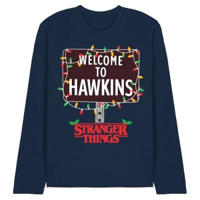 Stranger Things Christmas Welcome to Hawkins Unisex Long Sleeve T Shirt, Navy, XX Large