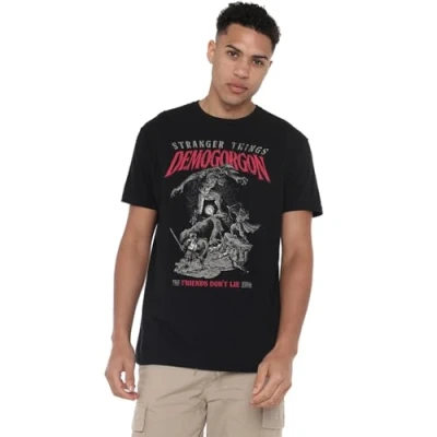 STRANGER THINGS - SEASON FIVE UNISEX T-SHIRT FOR MEN & WOMEN: Crafted from premium ringspun cotton, our T-shirts are the epitome of timeless style. Embrace your individuality with a look as distinct as you are. Created for everyday wear, our tees feature a breathable all-season mid-weight weave, ensuring comfort in a versatile tagless design. Beyond ordinary, our short-sleeve tee is built to last. VERSATILE FIT: Whether you're an icon, influencer, or a myth in the making, discover a facet for every version of yourself. Pre-shrunk for the perfect fit, our tees are meant to be worn daily. With a crew neckline, short sleeves, regular silhouette, and straight hemline, this top is designed for comfort. Casual and classic, it's the ideal choice for any occasion. Only good vibes here. OFFICIALLY LICENSED - Discover exeptional style with our officially licensed pop culture designs! Created by our in-house graphic art team, each piece is a proud representation of craftsmanship, meticulously designed and printed in the UK. Showcase your favorite characters and themes, making every wear a statement of your unique style! EFFORTLESS CARE: From school and work to hanging out with mates, our classic tee is tailored for the real world. No complicated care instructions – simply wear, wash, repeat. Launder cold and tumble or hang dry to maintain the longevity of your new favourite shirt. PERFECT GIFTING OPTION: Ideal for sharing the love, our thoughtfully crafted and vividly rendered T-shirts are perfect for any superfan. Kit your loved ones out for their next birthday, holiday, themed event, Christmas or special occasion.