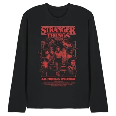 STRANGER THINGS - SEASON FIVE MENS LONG SLEEVE T-SHIRT: Crafted from premium ringspun cotton, our long sleeve T-shirts are the epitome of timeless style. Embrace your individuality with a look as distinct as you are. Created for everyday wear, our long sleevetees feature a breathable all-season mid-weight weave, ensuring comfort in a versatile tagless design. Beyond ordinary, this long-sleeve tee is built to last. VERSATILE FIT: Whether you're an icon, influencer, or a myth in the making, discover a facet for every version of yourself. Pre-shrunk for the perfect fit, our long sleeve tees are meant to be worn daily. With a crew neckline, long sleeves, regular silhouette, and straight hemline, this top is designed for comfort. Casual and classic, it's the ideal choice for any occasion. Only good vibes here. OFFICIALLY LICENSED - Discover exeptional style with our officially licensed pop culture designs! Created by our in-house graphic art team, each piece is a proud representation of craftsmanship, meticulously designed and printed in the UK. Showcase your favorite characters and themes, making every wear a statement of your unique style! EFFORTLESS CARE: From school and work to hanging out with mates, our classic tee is tailored for the real world. No complicated care instructions – simply wear, wash, repeat. Launder cold and tumble or hang dry to maintain the longevity of your new favourite shirt. PERFECT GIFTING OPTION: Ideal for sharing the love, our thoughtfully crafted and vividly rendered long sleeve T-shirts are perfect for any superfan. Kit your loved ones out for their next birthday, holiday, themed event, Christmas or special occasion.