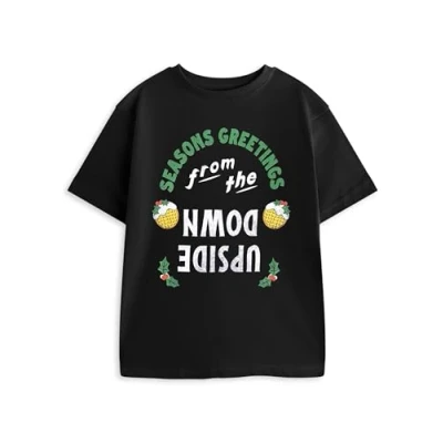 OFFICIALLY LICENSED MERCHANDISE This Stranger Things Unisex Kids Black Short Sleeved Graphic Tee is an officially licensed collaboration, bringing your child's favourite series right to their wardrobe with style and authenticity. STANDOUT HOLIDAY DESIGN Featuring the playful text 'Seasons Greetings From The Upside Down', this unique tee combines festive cheer with a nod to the iconic show, making it perfect for holiday celebrations or everyday wear. COMFY COTTON MATERIAL Made from 100% cotton, this T-shirt ensures a soft and breathable feel for all-day comfort, ideal for school days or cosy family gatherings during the holiday season. CLASSIC AND VERSATILE FIT The regular fit and classic crew neck design make this tee easy to layer or wear on its own, providing unrestricted movement for active kids while dressing up for themed events or casual outings. PERFECT GIFT CHOICE Ideal as a holiday present or for special occasions like Christmas, this stylish tee captures the festive spirit while allowing your child to showcase their love for Stranger Things, making it a must-have addition to their wardrobe.
