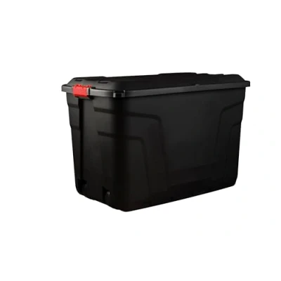 Strata Heavy Duty Large Storage Box with Lid, 190L, Lockable box, Indoor and Outdoor Storage. Wheels, Black Red Handles