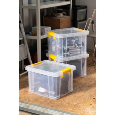 The Stackmaster Bonus Set 3 x 35L in Clear offers strong, stackable storage boxes made from durable recycled plastic, featuring secure clip-lock handles, large integrated handles for easy transport, and a wide open front for quick access—ideal for home or office organization.