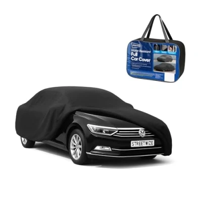 PROTECT YOUR INVESTMENT: This universal fit cover has been designed for modern-day impacts to your vehicles. The full-length car cover ensures that new wheels or an aging family van are protected against snow, rain, dust. IMPACT RESISTANT COVER: Made from premium grade material, this car protection cover is resistant to water, wind, UV rays, and ice. The windproof cover ensures that the hot sun cannot dull the original shade/tint. The breathable car cover sheet helps prevent condensation build-up. CONTOUR FIT CAR COVER: Streetwize car cover is precision cut with double stitched seams and elasticized hem to contour fit the vehicle. The reinforced seams keep the water & dirt out. This contour fit cover is heavy enough to stay grounded during a strong wind/storm. INDOOR OUTDOOR PROTECTION: This anti-frost car cover is designed to protect your ride at all times. All-weather cover dust-proofs the vehicle, protecting it against bird droppings too. It can help keep-up the shine of the vehicle’s original paint. PRODUCT SPECIFICATIONS: Available in a standard Black colour, this protection cover for cars comes with its dedicated storage bag to keep it clean, prolonging its lifespan. The dimensions of this waterproof cover are: L226" x W80" x H47"