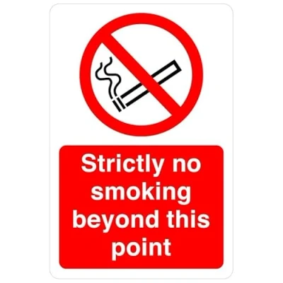 Strictly no smoking beyond this point sign - No Smoking Area Safety Sign to meet legal obligations and foster compliance. High-tack self-adhesive vinyl offers the optimal solution for indoor signage. Its easy application—simply peel off the backing and fix to your chosen location—makes it ideal for non-porous, flat, uneven, or curved surfaces Measuring 300mm x 200mm, our sign ensures optimal visibility when mounted at eye level for viewing within 7 meters, effectively enhancing safety and communication on the road network This sign conforms to EN ISO 7010:2012 standards, featuring a centrally positioned black pictogram or text against a contrasting background, ensuring clear communication and adherence to safety regulations Experience peace of mind with our comprehensive 4-year warranty indoor signage. We stand by our commitment to quality, ensuring durability and reliability for every product