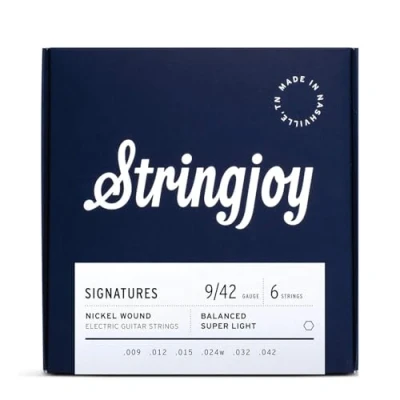Premium Tuning Stability: Stringjoy Signatures Nickel Electric Guitar Strings offer unmatched tuning stability and durability; Inspected meticulously, these electric guitar strings ensure your guitar resonates perfectly and stays in tune for longer sessions, providing a reliable performance every time Smooth and Balanced Playability: Enjoy effortless playability with our premium electric strings for guitar; Designed for optimal tension balance across the fretboard, these replacement guitar strings provide a smooth, even performance, perfect for both beginners and professionals; Choose from a variety of gauges to find the perfect strings that match your playing style and tonal preferences Exceptional Durability: Built to last, Stringjoy electric guitar strings are crafted from high-quality materials and rigorously tested to withstand rigorous playing; These durable strings reduce the need for frequent replacements, making them a reliable choice for electric guitar players About Us: Scott here—I founded Stringjoy in 2014 because I believe that better strings empower guitarists to play better, play longer, and forge a deeper connection with their instrument; Unlike many brands, we proudly craft every string in-house in Nashville, Tennessee, using state-of-the-art winding equipment; Our passion for perfection means we obsess over every detail, ensuring you get strings that sound fuller, play smoother, and last longer