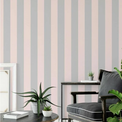 General description Features bold stripes in pale pink and metallic silver. This on-trend stripe design is perfect for creating a feature wall or for covering an entire room. Technical specifications Dimensions: 10m x 0.53m Coverage: approximately 5.32 sqm Installation Easy to apply - paste the paper Full hanging instructions are provided on the back of each wallpaper label Usage Spongeable for easy cleaning Good lightfastness to maintain color vibrancy Other information Free match which means little to no wasted paper All rolls of the same color ordered together will be from the same batch number
