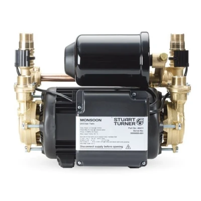 Stuart Turner Monsoon U4.0 Bar Twin Pump Monsoon Universal 4.0 bar Twin Pump. Designed for installation into vented systems to pump both the hot and cold water supplies boosting both equally. Suitable for both positive and negative head applications. 5 year warranty. 4.0 bar pressure. Suitable for positive or negative head applications. Premium quality brass pump supplied with flexible hoses with integral ISO valves. Very quiet operation. WRAS approved product. Continuously rated. Anti-vibration feet. EPDM/PTFE/Al. Oxide seal. Pre-wired with 1.5 metre power cable. UK Specification: Supplied with 22 mm push-in x 300 mm anti-vibration flexible hoses with integral isolating valves. Genuine brand new Stuart Turner product, covered by a Stuart Turner manufacturer's guarantee.