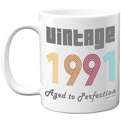 A GREAT VINTAGE MUG TO CELEBRATE THEIR BIRTHDAY: If you are looking for 1991 birthday gifts for women or men then look no further. This exceptional quality mug bears the wording - Vintage 1991 Aged to Perfection - It's bound to make them smile. Not just for a Birthday this mug could be as a valentines or Christmas gift. WHAT DO YOU GET: This funny Birthday present for her or him is made from the highest quality mugs available on the market. An 11oz ceramic gloss finished mug with a large handle for ease of use. The cheeky design is printed on both sides so no Two will miss it. Incredibly funny gifts for women and men from Stuff4 Ltd. Funny mugs for women, novelty mugs. Mum birthday gift, adult birthday gift. PACKED FOR PROTECTION: Every order is packed in a drop proof double walled cardboard Mug Mailer which are lightweight and strong enough to provide total protection. So have the work colleague or your best friend in pieces with these funny birthday gifts and not the rude mugs. For her birthday gifts and his, coffee mugs for men, funny cups, happy birthday Dad gift. MADE AND QUALITY CHECKED IN THE UK: We manufacture all our product right her in the UK so you can be sure of a fast turnaround and a product that is expertly made - 35th birthday present funny, 35th birthday gifts for men, 35th birthday gifts 11oz DISHWASHER AND MICROWAVE SAFE MUGS: Made from premium ceramic our 11oz heavyweight mugs are manufactured with a dishwasher safe premium coating. This means that the colours of your image will not fade from even after multiple cycles (up to 800) through a dishwasher and they are also microwave safe.