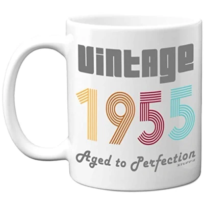 A GREAT VINTAGE MUG TO CELEBRATE THEIR BIRTHDAY: If you are looking for 1955 birthday gifts for women or men then look no further. This exceptional quality mug bears the wording - Vintage 1955 Aged to Perfection - It's bound to make them smile. Not just for a Birthday this mug could be as a valentines or Christmas gift. WHAT DO YOU GET: This funny Birthday present for her or him is made from the highest quality mugs available on the market. An 11oz ceramic gloss finished mug with a large handle for ease of use. The cheeky design is printed on both sides so no Two will miss it. Incredibly funny gifts for women and men from Stuff4 Ltd. Funny mugs for women, novelty mugs. Mum birthday gift, adult birthday gift. PACKED FOR PROTECTION: Every order is packed in a drop proof double walled cardboard Mug Mailer which are lightweight and strong enough to provide total protection. So have the work colleague or your best friend in pieces with these funny birthday gifts and not the rude mugs. For her birthday gifts and his, coffee mugs for men, funny cups, happy birthday Dad gift. MADE AND QUALITY CHECKED IN THE UK: We manufacture all our product right her in the UK so you can be sure of a fast turnaround and a product that is expertly made - 71st birthday present funny, 71st birthday gifts for men, 71st birthday gifts 11oz DISHWASHER AND MICROWAVE SAFE MUGS: Made from premium ceramic our 11oz heavyweight mugs are manufactured with a dishwasher safe premium coating. This means that the colours of your image will not fade from even after multiple cycles (up to 800) through a dishwasher and they are also microwave safe.