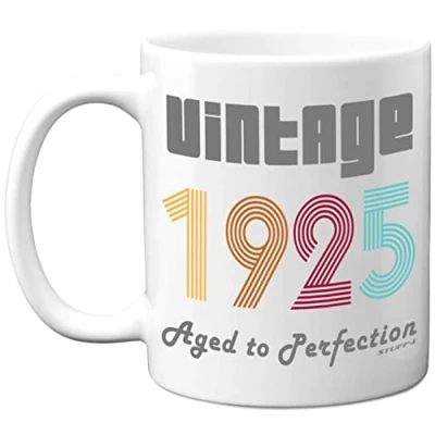 Amazon MarketplaceA GREAT VINTAGE MUG TO CELEBRATE THEIR BIRTHDAY: If you are looking for 1925 birthday gifts for women or men then look no further. This exceptional quality mug bears the wording - Vintage 1925 Aged to Perfection - It's bound to make them smile. Not just for a Birthday this mug could be as a valentines or Christmas gift. WHAT DO YOU GET: This funny Birthday present for her or him is made from the highest quality mugs available on the market. An 11oz ceramic gloss finished mug with a large handle for ease of use. The cheeky design is printed on both sides so no Two will miss it. Incredibly funny gifts for women and men from Stuff4 Ltd. Funny mugs for women, novelty mugs. Mum birthday gift, adult birthday gift. PACKED FOR PROTECTION: Every order is packed in a drop proof double walled cardboard Mug Mailer which are lightweight and strong enough to provide total protection. So have the work colleague or your best friend in pieces with these funny birthday gifts and not the rude mugs. For her birthday gifts and his, coffee mugs for men, funny cups, happy birthday Grandad gift. MADE AND QUALITY CHECKED IN THE UK: We manufacture all our product right her in the UK so you can be sure of a fast turnaround and a product that is expertly made - 100th birthday present funny, 100th birthday gifts for men, 100th birthday gifts 11oz DISHWASHER AND MICROWAVE SAFE MUGS: Made from premium ceramic our 11oz heavyweight mugs are manufactured with a dishwasher safe premium coating. This means that the colours of your image will not fade from even after multiple cycles (up to 800) through a dishwasher and they are also microwave safe.