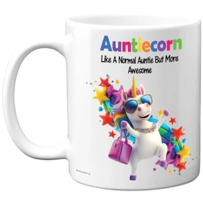 MAKE YOUR AUNTIE SMILE ON HER SPECIAL DAY: If you are looking for the perfect Mothers Day Gift for your Auntie then look no further. This exceptional quality mug bears the wording - Auntiecorn Like A Normal Auntie But More Awesome. Use for all occasions such as Mother's Day, Birthdays, Christmas or at any point to show your appreciation. Special birthday gifts for Auntie from Nephew or Niece. WHAT DO YOU GET: This novelty mug for her is made from the highest quality mugs available on the market. An 11oz ceramic gloss finished mug with a large handle for ease of use. The cheeky design is printed on both sides so no one will miss it. Incredibly funny and thoughtful gifts for women from Stuff4 Ltd. Auntie birthday gifts. PACKED FOR PROTECTION: Every order is packed in a drop proof double walled cardboard Mug Mailer which are lightweight and strong enough to provide total protection. So have the birthday girl in pieces and not the rude mugs. Mothers day gifts from Niece, Auntie birthday gift, Aunty birthday gifts, mother day gifts, Aunt birthday mugs. MADE AND QUALITY CHECKED IN THE UK: We manufacture all our product right here in the UK so you can be sure of a fast turnaround and a product that is expertly made - for Her birthday gifts. Great Auntie mothers day gifts from Niece or Nephew. Aunt birthday present from Nephew, birthday gift Auntie, mother’s day present for Auntie, Aunties birthday presents, mothers day gifts from Nephew, funny mothers day gift. 11oz DISHWASHER AND MICROWAVE SAFE MUGS: Made from premium ceramic our 11oz heavyweight mugs are manufactured with a dishwasher safe premium coating. This means that the colours of your image will not fade from even after multiple cycles (up to 800) through a dishwasher and they are also microwave safe.