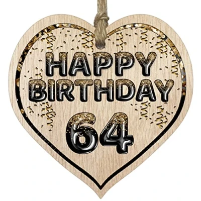 MAKE THEM SMILE WITH THIS BEAUTIFUL GIFT: This exceptional quality heart shaped wooden plaque shows the design: "Happy Birthday 64". If you are looking for funny thinking of you gifts for friends then then this hanging wooden heart is bound to make them smile. Not just for a women's 64th birthday presents also for men 64th birthday gifts for women friend. EVERY HEART IS TRUELY UNIQUE: Unlike other brands our beautiful plaques are made from raw wood and not a laminated MDF. This means that every single heart will have it's own pattern and indentation from the grain of the wood used. Each heart is hand finished with a lacquer varnish that really accentuates the the deep colour of the wood and also makes the ink of the pattern/text clearer and brighter in colour. WHAT DO YOU GET: This thoughtful presents for women is made from the highest quality wooden signs and plaques. Incredibly sweet cheer up positivity keepsake gifts for women and men from Stuff4 Ltd. MADE AND QUALITY CHECKED IN THE UK: We manufacture all our product right her in the UK so you can be sure of a fast turnaround and a product that is expertly made - mental health gifts, special friend gifts, miss you gifts for friends, positive gifts for women and birthday gifts for her or him. EASY TO HANG: The hanging wooden heart plaque comes equipped with a small jute twine, which can be then used to hang it on somewhere for decoration. The wooden sign is convenient for you to assemble without spending too much effort and time.