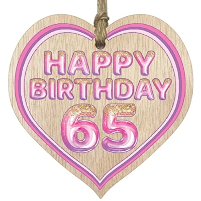 MAKE THEM SMILE WITH THIS BEAUTIFUL GIFT: This exceptional quality heart shaped wooden plaque shows the design: "Happy Birthday 65". If you are looking for funny thinking of you gifts for friends then then this hanging wooden heart is bound to make them smile. Not just for a women's 65th birthday presents also for men 65th birthday gifts for women friend. EVERY HEART IS TRUELY UNIQUE: Unlike other brands our beautiful plaques are made from raw wood and not a laminated MDF. This means that every single heart will have it's own pattern and indentation from the grain of the wood used. Each heart is hand finished with a lacquer varnish that really accentuates the the deep colour of the wood and also makes the ink of the pattern/text clearer and brighter in colour. WHAT DO YOU GET: This thoughtful presents for women is made from the highest quality wooden signs and plaques. Incredibly sweet cheer up positivity keepsake gifts for women and men from Stuff4 Ltd. MADE AND QUALITY CHECKED IN THE UK: We manufacture all our product right her in the UK so you can be sure of a fast turnaround and a product that is expertly made - mental health gifts, special friend gifts, miss you gifts for friends, positive gifts for women and birthday gifts for her or him. EASY TO HANG: The hanging wooden heart plaque comes equipped with a small jute twine, which can be then used to hang it on somewhere for decoration. The wooden sign is convenient for you to assemble without spending too much effort and time.